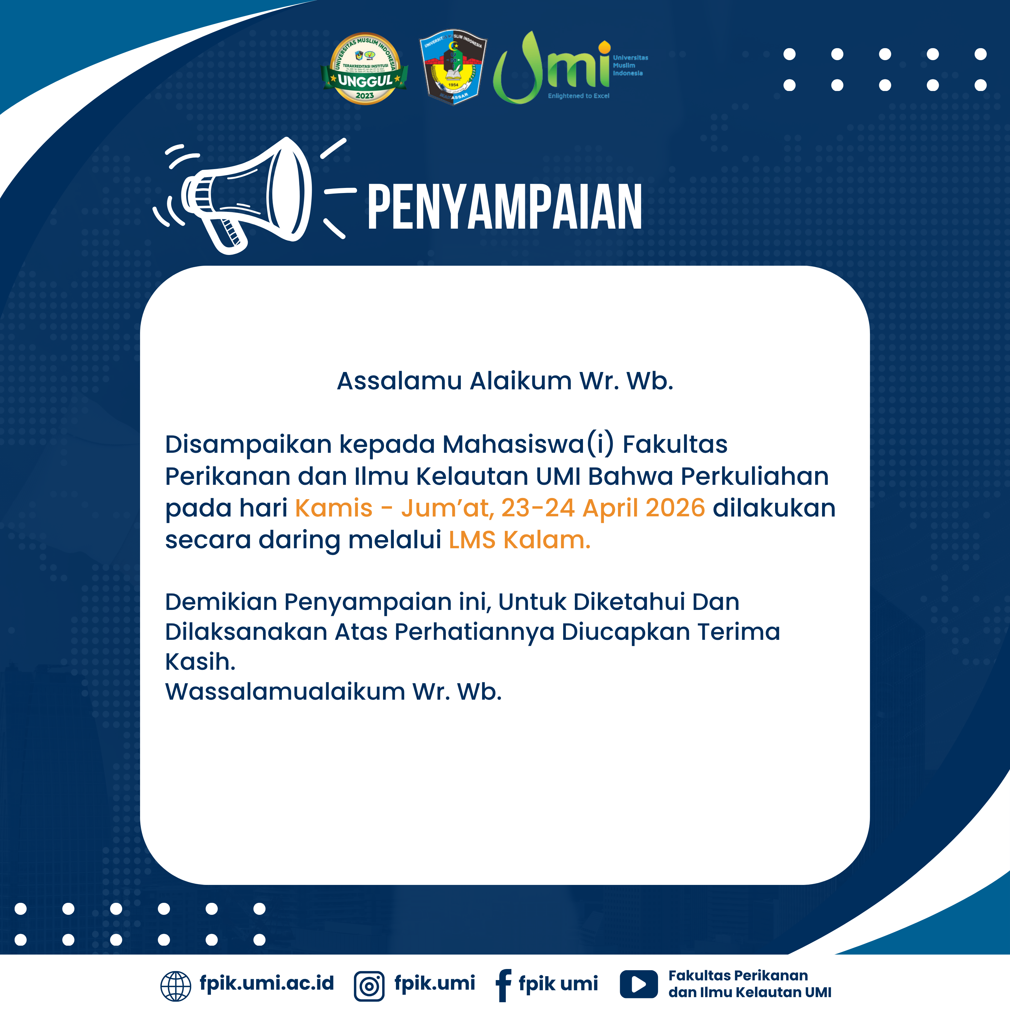 Makassar – Fakultas Perikanan dan Ilmu Kelautan (FPIK) Universitas Muslim Indonesia (UMI) menyampaikan penyesuaian jadwal perkuliahan